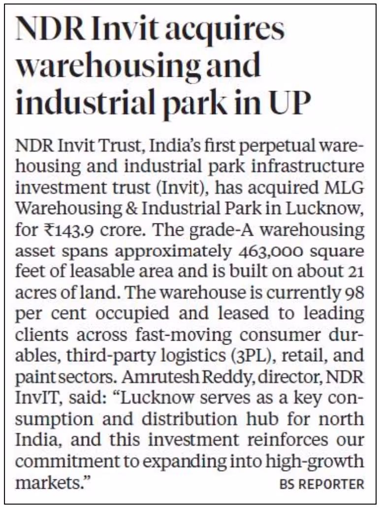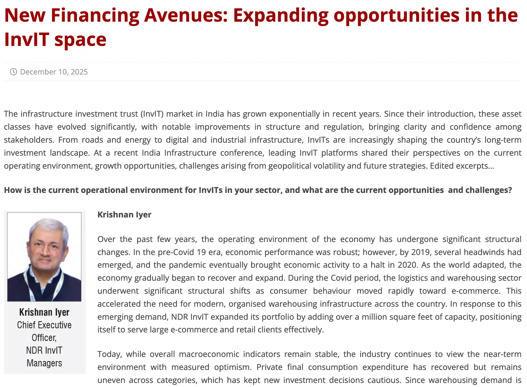 Investor Relations has duty to communicate visions, policies and business directions of NDR InvIT Trust (the “Trust”) to Unitholders, investors and general public, who are interested. The information disclosures shall be made regularly, completely, correctly, and on a timely basis based on both positive and negative facts. In addition, such disclosures shall be made thoroughly, fairly, and in accordance with laws, rules, and regulations of the Securities and Exchange Board Of India [SEBI] (Infrastructure Investment Trusts) Regulations, 2014, read with circulars, guidelines and notifications issued/to be issued from time to time by the Regulations.